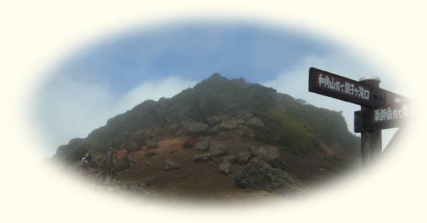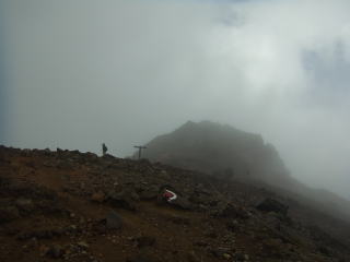 密生した樹林のおかげで強風から守られていたが、山頂直下になって無木立となり強風を受ける。くろがね小屋への分岐の先で初めて安達太良山の山頂が見えた。山頂は溶岩ドームかな?よじ登って風の弱いところで落ち着く。時々霧が薄くなると、稜線の先のピークや峰ノ辻方面が薄っすらと見える、一度でいいから晴れて全体を見せて欲しい。願いは叶わなかったが部分的には見え、なんとなく安達太良山の雰囲気が少しわかったかな。