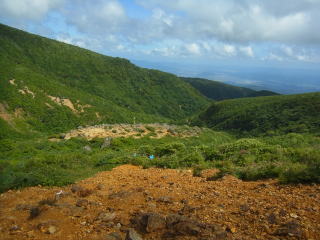 天気が悪ければピストンの予定だったが、まあ雨が降りそうなかんじではないし、予定通りくろがね小屋経由で帰るとしましょう。稜線は依然としてガスに覆われている時間がほとんどだが、一段下りるとガスはなくなり展望が効くようになってきた。登りに使ったルートに比べて変化があって楽しい。殺伐とした赤茶けた景色が印象的だった。