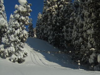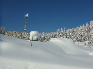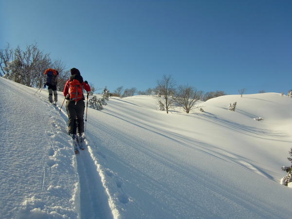 前日の未明に数十センチのドカ雪が降ったようですが、ギュッと詰まった雪のようで、スキーで乗ってもジワ〜ッと沈む程度。その上に新しくて軽い雪が10センチくらい乗っかっていました。なので、ラッセルによる時間と体力のロスは少しだけ。ちなみに足で乗ると腰くらいまで埋まる。低い電線に触らないように気を付けながら林道を辿って大峰峠へ。