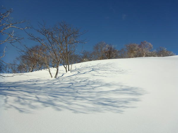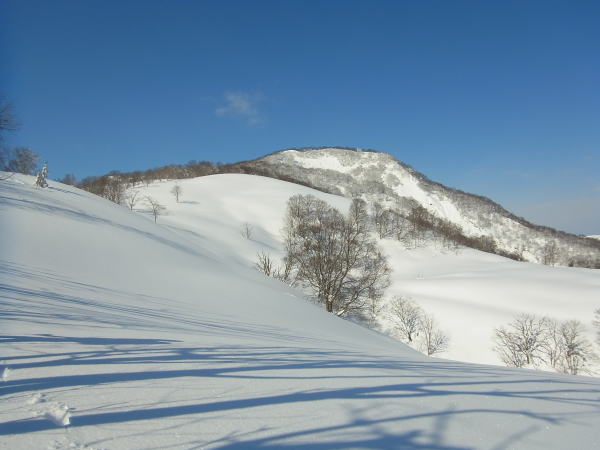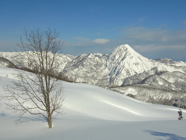 まずは北西方向へ滑りますが、ちょいと右に寄り過ぎて谷間に吸い込まれ、ひと滑り分ほど損してしまいました。底アリの軽くて浅いパウダー。板が暴走してターンが間に合わない。浅い溝状で食らって惨コケしたり、ブーツをスキーモードにするの忘れて後ろにコケたり・・・。明星山がド〜ン!と見える幼杉の疎林対は気持ちよく滑れました。