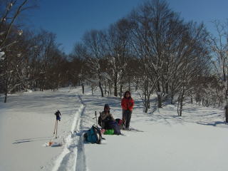 山頂への急坂が始まる前のコルで休憩。無風でポカポカで休憩がちゃんと休憩になります。後ろから誰も来ないところをみると、さっきの2台は団体さんかな。個人の早い人もいなさそう。最後のブナの登りは、これまでより少し雪が深くて汗をかいた。そのぶん山頂ビールが美味しかった。