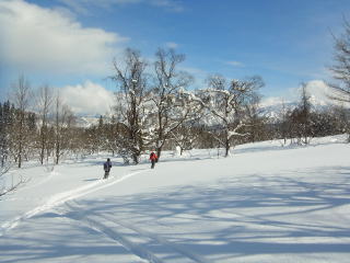 いつの間にやら雲が増えてきて、さっきまで見えていた明星山もすっかり隠れてしまった。赤禿山の山頂あたりにも雲が・・・。本日2度目のシールで池の東の尾根に乗り、車道の通るところでシールをはずして赤禿山東斜面の滑り終了点向けてタラ〜ッと滑ります。ここで3回目のシール装着。林道を辿って山之坊へと戻ります。あとから来た人たちは既にいませんでした。