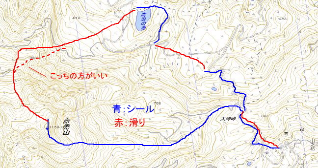 2011年の赤禿山 2010年の赤禿山 2009年の赤禿山 2008年の赤禿山 赤禿山に高浪の池を絡めるルート、昨年行って良かったので今年も行ってきました。赤禿山から北西の向きに滑り込み、明星山を見ながら時計まわりで高浪の池へと降りていきます。ド〜ン!と滑れる斜面はありませんが、豪雪の里山を満喫できるピクニック系のルートです。滑るだけなら普通に東斜面を滑るほうがコンスタントに楽しめます。