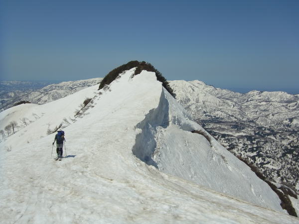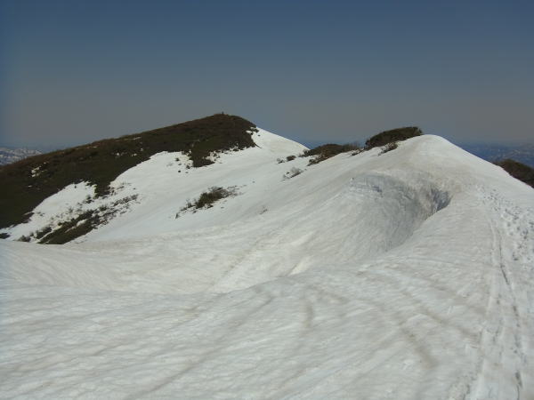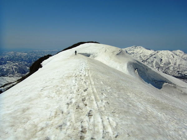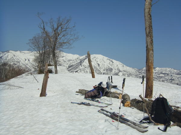 杉林の中で一度断念しかけたおばさんと前後しながら登ります。GWともなれば尾根の雪は減ってきて、だいぶヤブが起き上がってきています。若干モジャモジャ感があったけど、雪が切れることはなく続いていました。登るの楽でいいですね、この尾根。