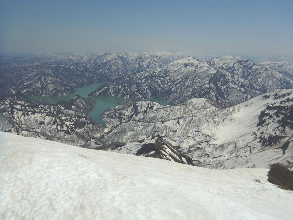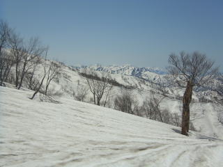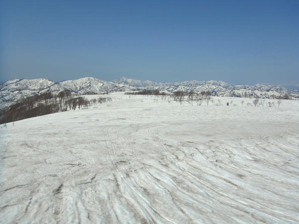 さて、いざ早坂尾根突入です!笹ヤブを少し抜けると、眼下には広大な斜面が広がっております!斜度は緩いので豪快に滑ることは難しいけど、他にはないこのロケーションは特筆もんです。滑っても滑って景色が変わりません。雪質は標準的なザラメ。板の滑りはまずまずでした。新雪とか重雪だったら、この斜度滑るの大変でしょうね。とても末端までは滑れない感じ。