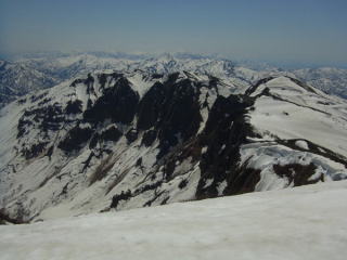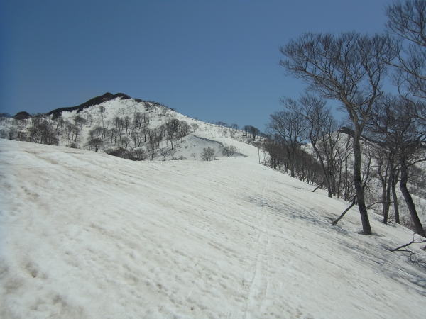気持ちのよい尾根をのんびり歩き、2度目の休憩は嘉平与ポッチといわれるピークの先。1484mのとこです。いかにもポッチって感じのピークでした。ここから前岳まではひと登り。右手にムジナ沢源頭部の大斜面を見下ろしながらの歩き。確かにこの大斜面はスバラシイけど、谷底まで滑ってしまったらオシマイなんですよね・・・。