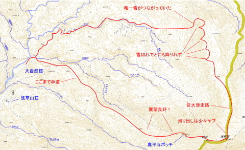 1206mの標高点を過ぎたあたりから、降りるルートを探しながら滑る。一度尾根筋を少し降りてみるが、どこも雪が切れてしまっている。対岸に雪が繋がっているところを発見したけど、そこに行く間に見失ってしまった。通り過ぎてしまったみたい。さらに何度か偵察するも、微妙につながっていない。まあ、最悪は少しの間だけ板を背負えば何とでもなりそうなんですが・・・。何度か登り返して疲れてしまった。