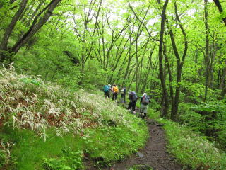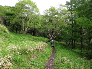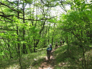 あとは下って終了なのですが、ここからの樹林帯は日を浴びて緑が眩しいくらい。下りも新緑を満喫です。今日は登り始めから下山するまで間延びするところがなく、外輪山を歩くことはできなかったけど充実しておりました。メンバーもかなり新鮮だったし。あとは赤茶色の天狗温泉に入っておしまい。次は外輪山と湯の平を紅葉の時期に歩くことにしましょう。