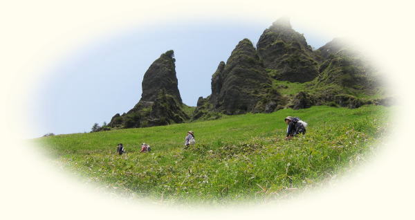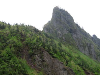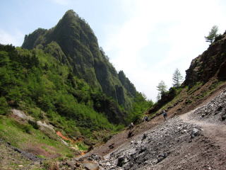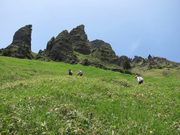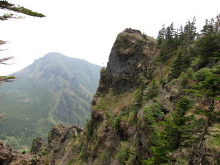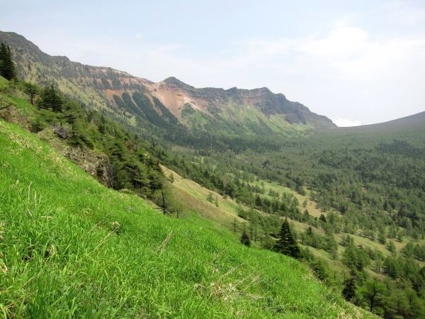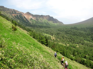 火山館からしばらくで分岐。前掛山に行く人の方が多いみたいですね。草すべりからトーミの頭へと崖登り。見た目は崖だけど、道はうまくジグザグが切ってあるので、大変な登りってわけではない。笹の斜面に岩峰がそそり立つ景色が面白い。振り返るとお椀型の前掛山。だだっ広い湯の平も見おろすことができる。