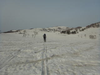 念仏ヶ原避難小屋から裏の斜面を適当に登ったら1185mポコへ。タラーッと下って左折し、1199mへの登り返し。このあたり広々としていてとても気持ちいいです。月山の眺めが雄大なのですが、如何せん空が・・・。贅沢言っちゃいけませんが。それにしても暖かい朝です。この時期の晴れた朝だと雪が堅いのが常ですが、今日は朝からソフトな雪でシールもよく効いてくれます。