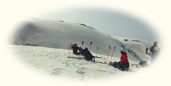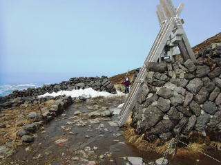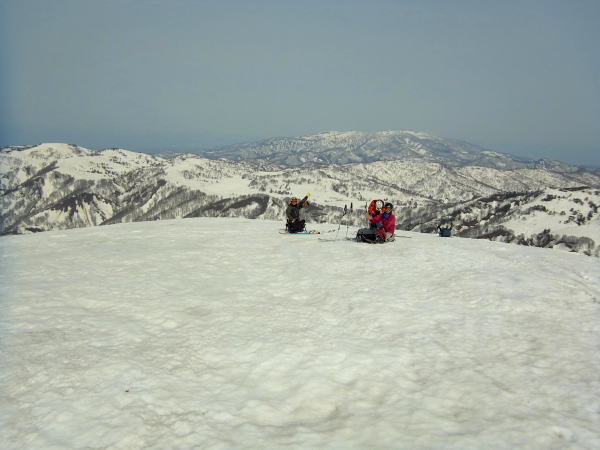 牛首からひと登りで鍛冶小屋跡へ。ここからは山頂台地まではいつも雪が付いていない。板をザックにくくり付けての登りとなりますが、風が強いのも例年通りであおられます。台地に登り切ったところからも滑り込めますが、初月山のTピーがいるので山頂へ。建物を風除けにして休む。