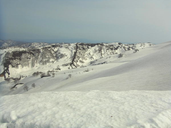 急斜面を降りたとこの丸いピークで休憩。とっても雰囲気の良いところです。月山の台地状が落ち込むところが一望でき、なかなか雄大な眺めです。落ち込んだあとも魅力的な斜面が谷底まで続いています。アプローチさえクリアできれば、あちこちウロウロしてみたいところです。朝に比べて若干空が白んできた感じ。