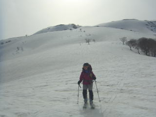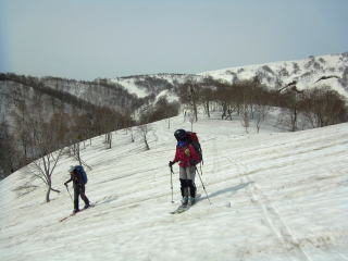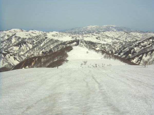 長いツアーもいよいよ最後のピーク大森山となりました。手前の山が邪魔して肘折温泉は見えませんが、まだまだ随分距離はあります。ただ、顕著な登りはもうないので気は楽です。大森山直下は木の穴だらけの急斜面。いったん尾根に乗り、林道に向けて滑り込みます。