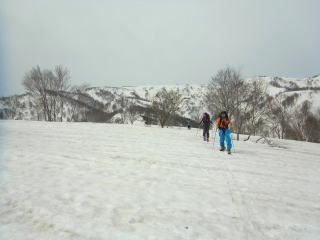 立谷沢川に降り立ちます。夏道に架かる橋は埋没しててわかりません。ここから念仏ヶ原への登り返し。尾根の末端から確認していた唯一雪がつながっている谷を詰めます。念仏ヶ原までは標高差約150mってとこでしょうか。登りやすい谷でした。で、斜度が緩くなり、念仏ヶ原に登り上げます。あまりののどかさに”おおおーっ”と声が出ます。月山方面が逆光でしら〜っとしてたのが少々残念。翌朝に期待!