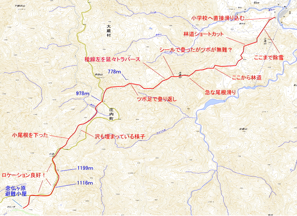 林道は滑れない部分がけっこうあってダルかったなあ。朝日台に降り着き、除雪してある車道に出ましたが、わざわざ対岸に渡って再び板を履きます。そして朝日台の末端まで行くと小学校が見えました。なるほど、こういう終わり方か・・・。このへんは入念なリサーチが成せる技ですな。