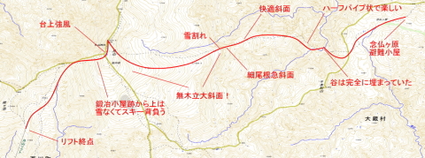 | 月山スキー場リフト上(10:50)⇒牛首(11:55〜12:15)⇒月山山頂(13:20〜50)⇒千本桜付近(14:25〜15:00)⇒立谷沢川(13:25〜40)⇒念仏ヶ原西端(16:05)⇒念仏ヶ原避難小屋(16:40) |
