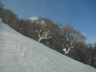 穏やかとはいえ寒いので出発。警戒しながらターンしてみる。軽い雪ではないけど、埋まらないので悪くはない。少し調子が出てきたあたりで斜度が増し、日陰の斜面に突入。すると急激に雪質悪化・・・。表面が堅くて中が柔らかい。完全なモナカにはなってないけど、いとも簡単に前転してしまう。3回くらい前転してイヤになると、気が引けて腰も引ける。こうなったら滑れませんね。アルペンターンでこなしながら降りることに。中間のブナ帯では雪が飛ばされているところと、吹き溜まっているところが交互に現れ難儀した。下部の密林地帯は木にぶつからないように気を付けるのが精一杯でございました。