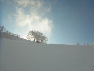 雪は新雪なんだけれどもチョット重い感じ。年末年始にしては多い雪だけど、絶対量としてはまだまだこれから。埋まり切っていない小枝や幼木がまだたくさん顔を出している。進むにつれて傾斜が増してくるが、傾斜が増すにつれて雪が堅くなってきた。はじめはスネくらいのラッセルだったのに、もう板が埋まらなくなってきた。滑りが思いやられるなあ・・・。