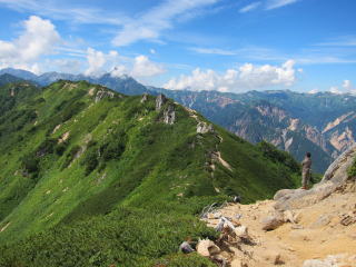 2005年の時は西岳に泊まって、朝のうちに赤沢山と西岳に登ってきた。もちろん今日は登りません。西岳まで雲ひとつなかったのに、このあたりから少しずつ雲が出始める。この3日はずっと同じような感じだったってことだな。北鎌尾根がちょうど真正面になる赤岩岳あたりでは、槍の穂先と独標に刺さるように雲が出た。主役の2つがこうではねぇ〜。学生風の6人組と前後しながら歩いていた。