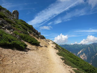大天井ヒュッテから切通し岩までのトラバース道、これがキツイというかダルイというか。トラバース道とはいえ結構登りも多いしなあ。そして最後の試練が大下りの登り返し。足にはくるけど、こっちの方が登りに没頭できて気持ち的には楽かな。ただ、ゴールが近付くにつれて近くのものが遠くに感じられるようになってきた。