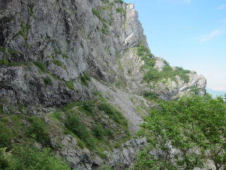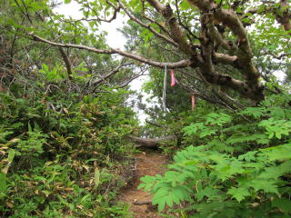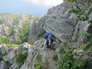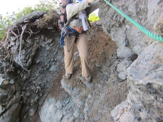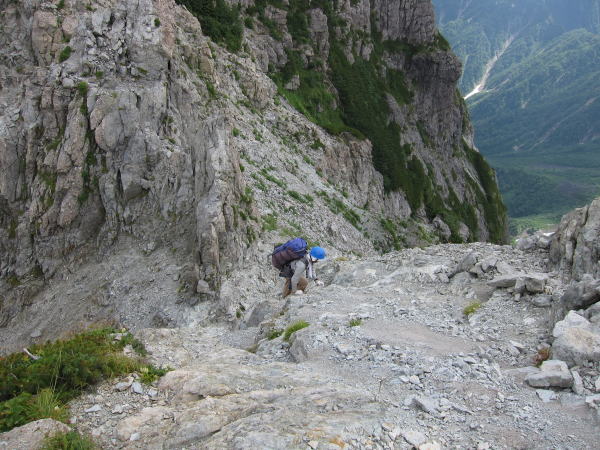 独標基部まで来ました。緑のビニール製のロープが張ってある。前に来た時よりも足場が悪くなった気がする。たくさん人が通るもんだから、落ちてしまったんでしょうね。通過には問題ナシです。しばらくスタスタと歩くと出っ張った岩のところ。くぐるように歩くか、一段下の足場を使うかで楽に通過可能。さらに歩くとフィックスロープのあるチムニーへ。ロープを引っ張ると固定してあるハーケンが動くもんで使うのを躊躇した。でも、使わないと荷が重くて登れない・・・。結局ロープに頼って登る。登り切ったところから高度感満点の快適クライミングで独標手前のコルへ。