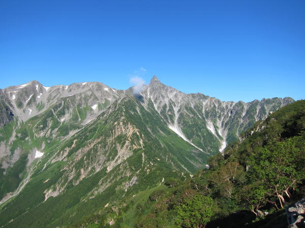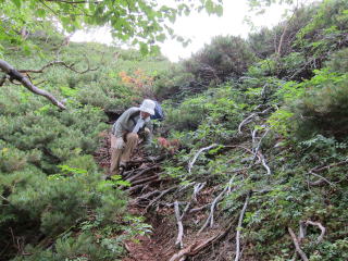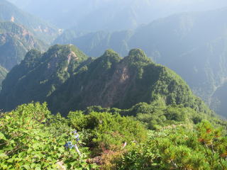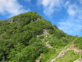 水俣乗越から西岳への登りが今日一番の試練。標高差200mほどだけど堪える。登りの途中で北鎌沢を下ってきた単独のおじさんに再開。向こうも覚えていたみたいでした。西岳に泊まったんでしょうね。きつい登りだったけど、朝のうちは日陰でありがたかった。