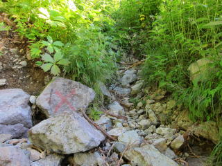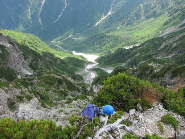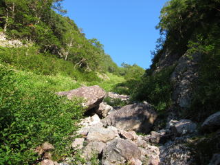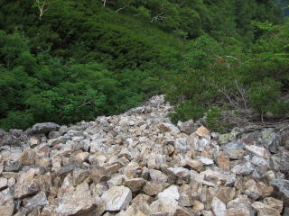 大天井ヒュッテからは15分ほどで貧乏沢の下降点。ここに古びた標識とピンクテープがぶら下がっている。よほどボケ〜っと歩いていない限り見落とすことはないでしょう。稜線を乗っ越す明瞭な踏み跡もあるし。で、その明瞭な踏み跡で稜線を乗り越すと、ハイマツ地獄に。ハイマツの枝に乗りながら越えると、ゴロゴロ帯の下りになる。あとは沢の真ん中を下ったり、左岸の踏み跡を辿ったり。