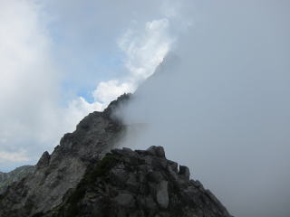 槍ヶ岳の山頂はダダ混みでもないし、ガラガラでもない感じ。日曜の昼間というのはこんなもんか・・・?やっぱり若者が目立ちますね。「キタカマ」を知らない若者も多いでしょうね。二度目のキタカマということでとくに感慨もなく、20分ほどで下山にかかる。初めての時もとくに感慨はなかったか・・・。槍の山頂から辿ってきた北鎌尾根が雲で見えなかったのは残念だったなあ・・・。