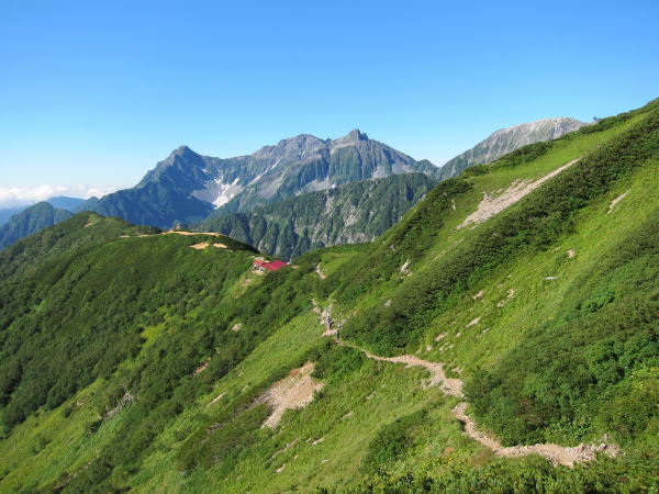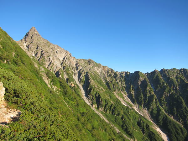 出発前に小屋に立ち寄り、K志さんにあいさつして下山開始。下山とはいえ、燕山荘までは立派な縦走だ。気持ちが下山モードにならないようにしなければ・・・。槍の穂先はもちろん、大喰岳や南岳などにも日が当たって赤く染まっていた。穂高は要塞のようで威圧感たっぷり。朝の絶景を見ながら東鎌尾根を下った。北鎌尾根も見えるけど、角度がちょっと甘いなあ。