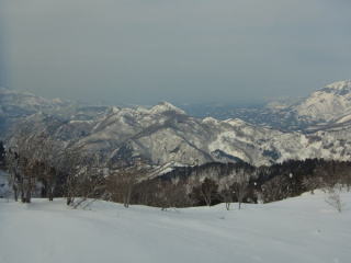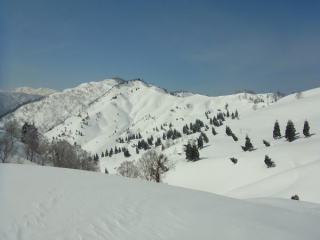 今シーズンの本命の一つである大渚山から真那板山へのスキー縦走。大渚山には何度も登っているし、昨シーズンには真那板山にも登った。間をつなぎに歩くのは必然でしょう。この間の稜線はとくに目を引くわけでもなく、世間に知られているわけでもなし。ところが歩いてみるとロケーション良好!稜線自体も明るく開放的でしたが、周囲の展望がスバラシかったです。地味で低い目線から見るもんで、周りの山々が余計に立派に見えるのかもしれませんね。