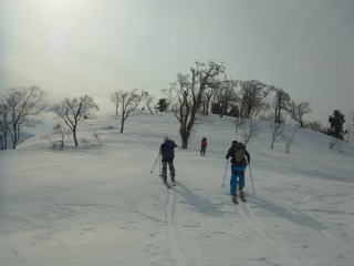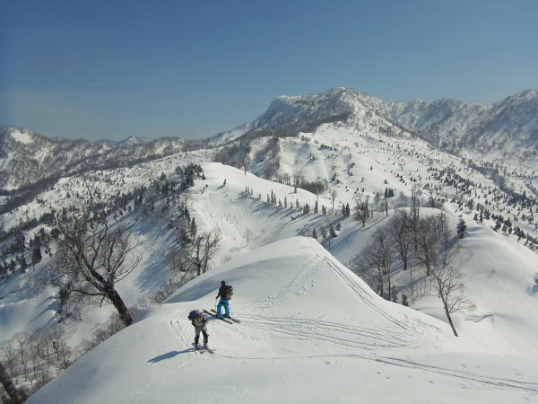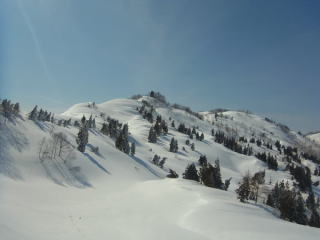 結局は1258mポコを半分くらい巻いたところで滑るのをやめてシール。1258mの先のコルで稜線上に。登り返しはほとんどなく稜線に復帰できたけど、思い切って1100mくらいまで滑った方が楽しかったかも。そのぶん登りは多くなるけど、トラバースすることなく斜面なりに谷底まで滑ることができるので。ま、そのへんは好みかな。