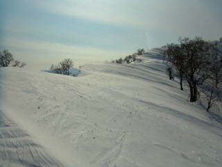 大渚山本体の登り。東面三角斜面の稜線の縁を歩くことになる。ここはいつも嫌らしいイメージ。今日も嫌な感じで、バンバンっとしっかりスキーで踏んでやらないと足場が固まらない雪。踏むのに力を入れると腰がジンジン痛い。汗かきながら登っていた。尾根上が歩きやすいかも・・・と、雪庇を乗り上げて様子を見てみるけどダメ。あきらめて三角斜面の縁に戻って、嫌らしい急斜面をトラバースし切った。