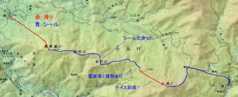 標高を下がると徐々に斜度が緩み、敵は斜度から雪質へ。モサモサ雪に変わってきた。ストックは底なしに埋まる。滑る板も埋まるので曲がれない。腰が痛くて膝を突っ張るもんで余計に曲がれない。わかっていてもダメ。救いなのはブレーキ雪じゃなかったこと。これでブレーキかかりまくりだったら、もうお手上げだったでしょうね。この下りはボクのせいで大きくロスタイムしただろうな。でも、まあ何とか普通の時間に下山できたので許してもらいましょう。 大網集落の雪壁を降りて車道へ。5分も歩けば車を止めた場所。小谷温泉で車を回収したところで雨が降り出してきた。白馬では本降りになり、そのうち湿り気たっぷりの雪に変わった。みみずくの湯で温泉にはまって、ラーメン食って帰ったら夜9時でした。