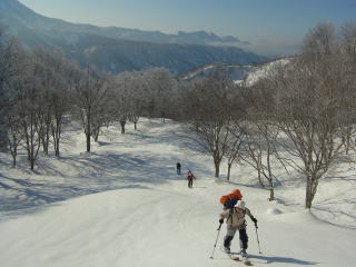 東西に長い大渚山の頂稜へ。三角点のある西端には大勢の人がいます。ウチらが着くのと入れ替わりに戻って行った。多分大草連へ。夫婦っぽい2名は北斜面へ。大渚山の北斜面って昔から有名だったのかなあ・・・?北斜面は軽い雪が温存されてそうだし(表面だけ)、ブナの樹氷もキレイだし、今日もいい感じじゃないでしょうかね。