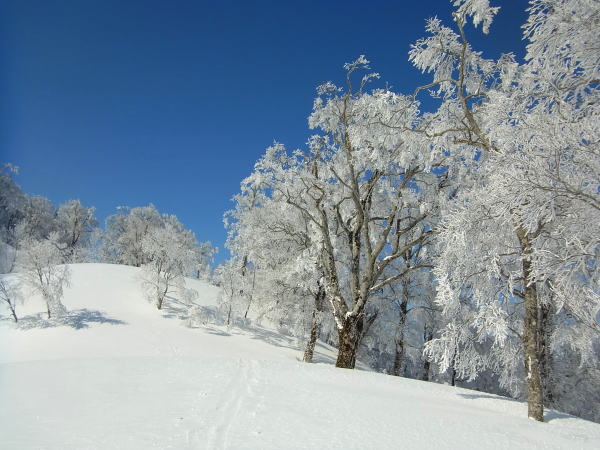 西面にこんなにキレイな斜面が隠されているとはね。隠していたわけではないだろうけど、新たな発見でした。意外と長く滑れるし。1本目は広葉樹の疎林だけど、すぐに杉の疎林に変わる。地形図では広葉樹マークなんですが。これって雪がなかったら全面杉の幼木が出てくるのかなあ・・・?雪が少ないとヒゲの剃り残し状態になるとか。いずれにしても、ほぼオープンで適度な起伏があって楽しい斜面です。腰さえ悪くなければもっと・・・。