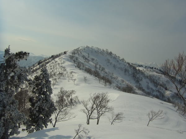 真っ白な大渚山がよく見える林道で休憩。今日の目的は真那板山まで縦走することだけど、ここらへんを歩いているだけで満足感に浸れた。腰が痛いのに頑張って来た甲斐があった・・・と思えてしまうほどのロケーション。本番はこれからなんですけどねぇ〜。湯峠からは稜線歩き。段差があって面倒。シールで滑るのは前後に不安定で腰にきそうで怖い。絶対に転べないし。それにしても北面のブナはキレイですな。