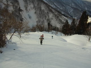 さあ、普通ならば待ちになった滑りってとこですが、今は不安オンリー。まともに滑れないのは確実で、転がってでも降りなくてはならない。北面は既に日陰でモナカを心配したが、まだできる前で助かった。滑り出しでボテゴケしたら、一人では起き上がれなかった。核心の沢形の急斜面は良くはないけど悪くない雪で、ここも助かった。