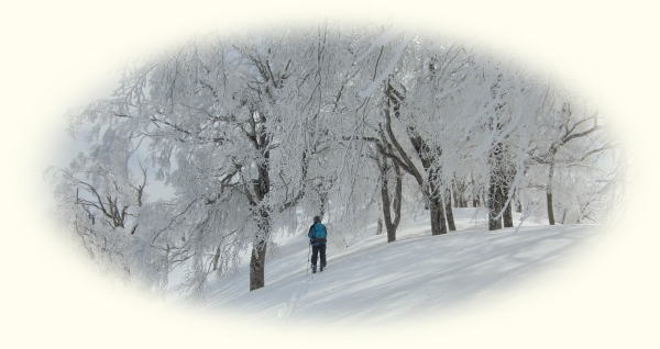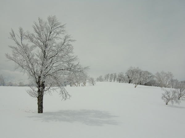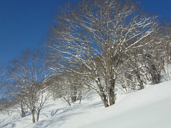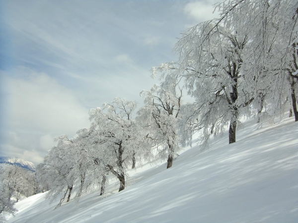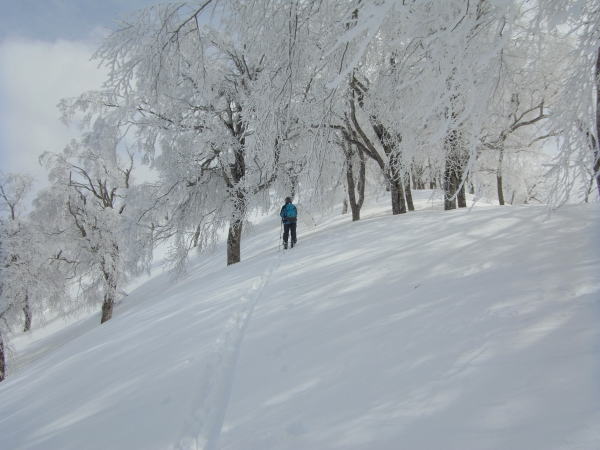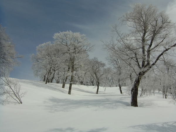 コルまで尾根を滑り、いよいよヨダレ斜面へ。新雪の深さはないものの、底アリ浅パウの軽い雪。止まるのがもったいないので、谷底まで一気に滑りました。この時期に来て今シーズン3本の指に入る気持ちよさだったかもしれないなあ・・・。ま、今年は深雪をまともに滑れてないからなあ・・・。対岸に渡って大渚山へと登り返します。天気は意外と悪くなく、空は白いけど依然として日は差します。ブナの樹氷が白黒できれいでした。