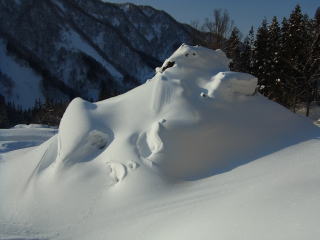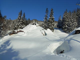 朝から快晴!空は真っ青!問題は何時までもってくれるか・・・。昨日の未明にかけて日本海側ではドカ雪となり、里でも30センチくらいの新雪。山は真冬の景色を取り戻していることでしょう。大草連へは一番乗り。雪は例年よりもかなり多め。雪が落ち着くこの時期でこれなので、2月とかはすごかったことでしょう。ウワサには聞いてたけど、見える範囲だけでも民家が3棟倒壊してしまっていました。