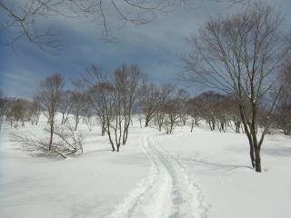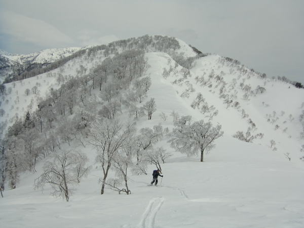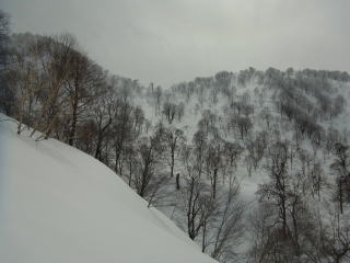 1476mへは手前のコルに上がる浅い沢を詰めます。この登る斜面は樹林の疎ら具合といい、斜面のツルツル度といい、ヨダレ物。1476mに登った後に、尾根通しで大渚山に戻る予定だったけど、この斜面を滑らない手はない。普段は繰り返し滑るために、わざわざ登り返すことは滅多にしません。しかし、今シーズンのラストパウダーになるかもしれないと思い、登っている最中にここを滑ることに決めたのでした。