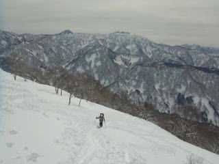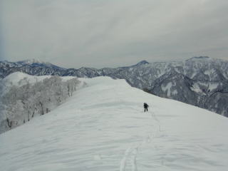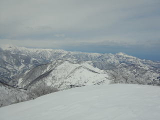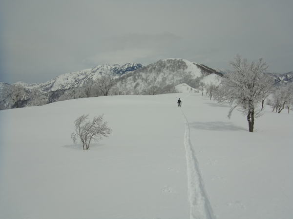 1476mは狭い牧場といった雰囲気。一番西の端まで歩きます。北アルプスがグッと近づいたように感じます。雪原に若いブナがポツリポツリと生えていて、とてものどかなところでした。今日は空が白んでいるので残念ですが・・・・。先日の真那板山への稜線もよく見えます。ゆっくりしたいところですが、天気は下り坂なので先を急ぎましょう。