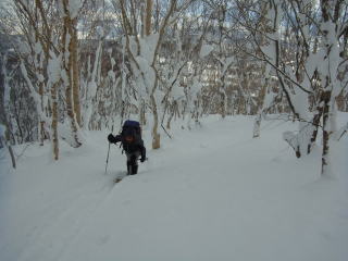 密林帯を抜けると、いよいよ下界から見える疎林の斜面。下から見ても気持ち良さそうだが、実際にここを歩いてても気持ちよかった。疎林斜面は完全にリセットされてて、ラッセルはヒザくらい。軽い雪なのでそれほど苦にはならない。それでも400m登るのに1時間45分かかっているので、それなりに時間は食ったってことでしょう。