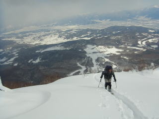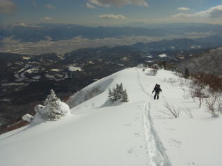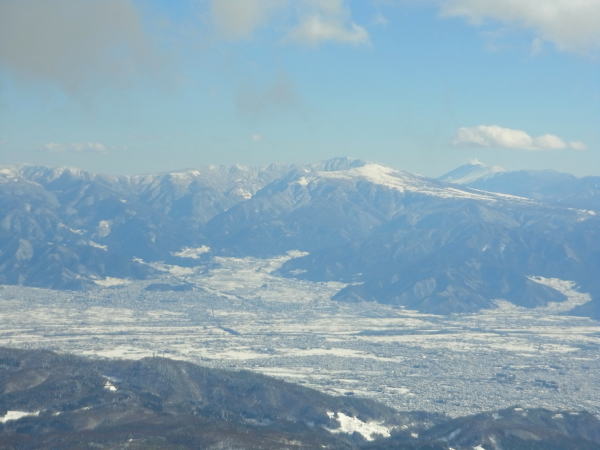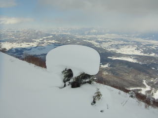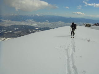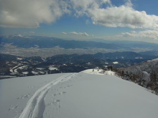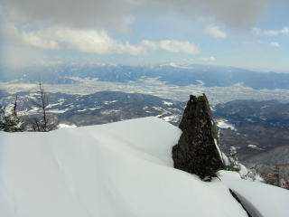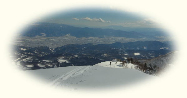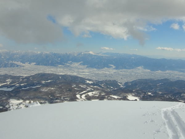 飯縄山の右隣にある霊仙寺山。山頂からちょこっとだけ疎林の斜面になっているのが、長野市内からよく見えます。たいした斜面ではないだろうけど、仕事中とかに見てると気になります。強い冬型が続いて少し緩む本日、飯縄あたりなら晴れるかも・・・?と行ってきました。長野市内からよく見えるだけあって、霊仙寺山の山頂からは善光寺平を見下ろすロケーションは開放的で、その向こうの山々(野沢〜志賀〜菅平〜浅間山)のパノラマを堪能できました。
