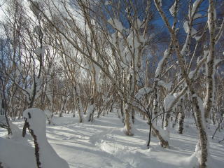 ボチボチ登るかとスキー場のトップで準備をしてたら、T世さんシールを車に忘れてきてしまったみたい。もうひと滑りのオマケ付きとなりました。1日券でよかった。結局、登り始めたのはお昼になってしまったのでした。本日の先客はナシ。ここ数日のトレースの痕跡はありました。最初はカンバの密林。滑るの大変かも・・・。