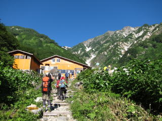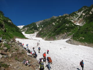 白馬尻小屋前のテラスも黒山の人だかり。この小屋は冬場は解体されるので見たのは久しぶり。ちょうど白馬沢が出合うところにあるんですね。ここから雪渓に取り付けるかと思いきや、まだしばらくは夏道を歩かされる。暑いなあ・・・ダルいなあ・・・眠いなあ・・・。10分くらい?で雪渓の取付きへ。