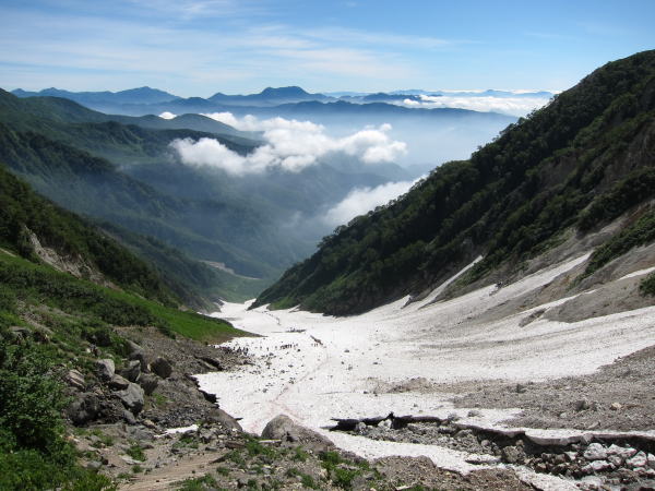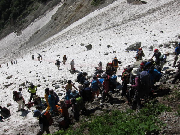 ほとんどの人がここでアイゼンを着ける。着けるのが面倒だったのでノーアイゼン。アイゼンあってもなくても登りは大差ナシかな。でも下りは一部急なところがあって、そこは欲しくなりそう。大雪渓の真ん中に一列に伸びる長い行列。みんな同じペースで登るわけで名ないので、ところどころ隙間はあるものの、見えてる限りずっとつながっていた。