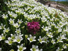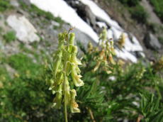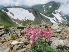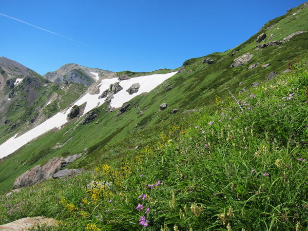 ずっと雪渓の登れれば楽だけど、谷の斜度が急になる手前で雪渓から左岸の夏道に戻される。落石地帯のため不安定な石がゴロゴロで気を遣うところだ。花もチラホラ出てきたけど、人も多いし落石も恐いので写真は無理。岩室の先で登山道は広くなり安定してくるので、そこからは写真を撮ったりしながらゆっくりと歩いた。レンジャーだのパトロールだの多かったなあ・・・。ご苦労様です。