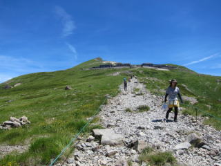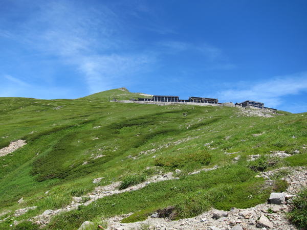 稜線に出ました。祖母谷温泉組は9時か10時に登り始めて、コースタイムは5時間くらいなので、不帰岳避難小屋に着くのは4時ごろか・・・?こちらも4時頃に避難小屋に着くように降りよう。ということで、今はまだ10時半すぎ。とりあえず白馬岳山頂に行くべ。いつもそうだが、村営宿舎から白馬山荘は近くに見えて遠い。それだけ巨大な山小屋だってことか・・・?