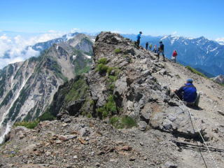 今日も天気は安定しているようで、この時間になっても雲が上がってこない。何度来ても白馬岳の展望は雄大です。大雪渓にあれだけ人がいたので、山頂は踏み場もないくらいかと心配していたが、取り越し苦労。まだみなさん登ってるとこなんでしょうね。時間が経つにつれて増えてきそうな予感。