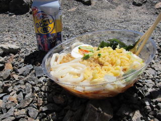 今日はザックにビールを3本忍ばせてきたが、まず1本目は白馬岳山頂で。コンビニで買ってきた冷やしうどんを一緒に食べます。真夏の暑い時期はパンとかおにぎりは喉を通りにくいので、こういうツルツルっと入るうどんは食べやすくていいですね。